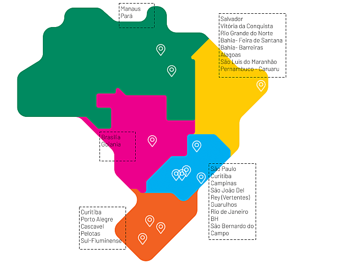 The following states have regional hubs: Amazonas, Federal District, Minas Gerais, Mato Grosso do Sul, Paraná Rio de Janeiro, Rio Grande do Norte, Rio Grande do Sul, Santa Catarina, Sergipe, and São Paulo.