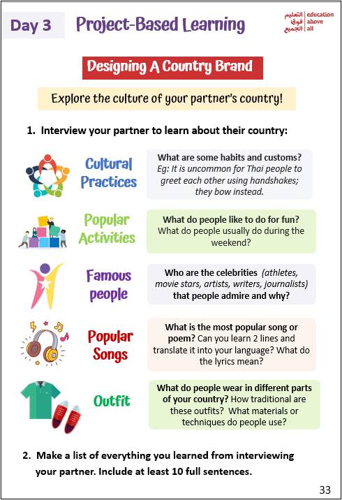 An example of a day's learning in the Integration Package. Students interview each other to develop a stronger understanding of each other's culture.