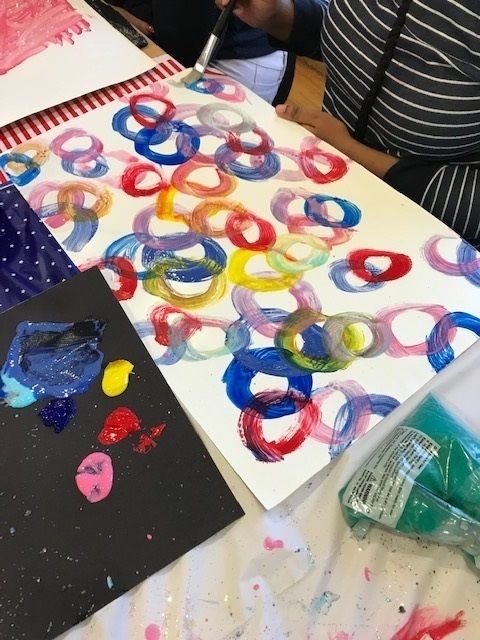 Residential teens created artwork using mixed media. They used paint, sand, glitter, fabric, and more.