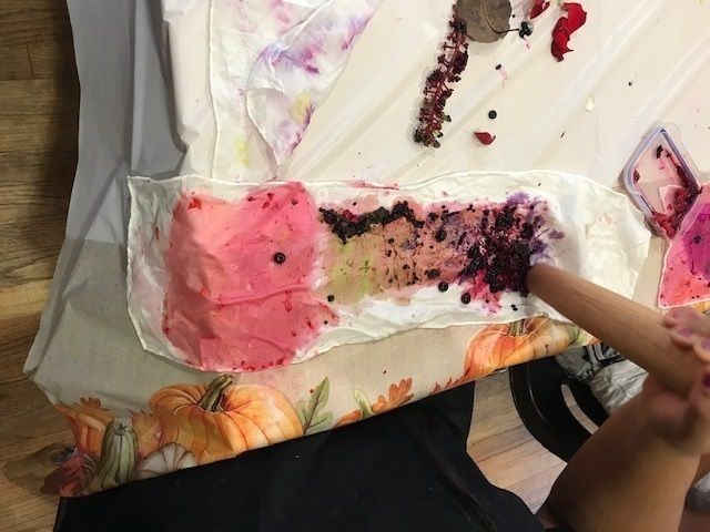 Youth dyed silk scarves using the "bundle dyeing" method using plants. Local flowers, berries, and leaves were used, as well as some items bought from the store such as fruits and flowers, to dye the silk scarves. The youth learned about using alum as the mordant to treat the scarves, and how the plant material bonds to the scarves because of the use of the alum. When completed, the scarves were bundled using rubber bands and steamed in order for the plant material to adhere to the scarves.