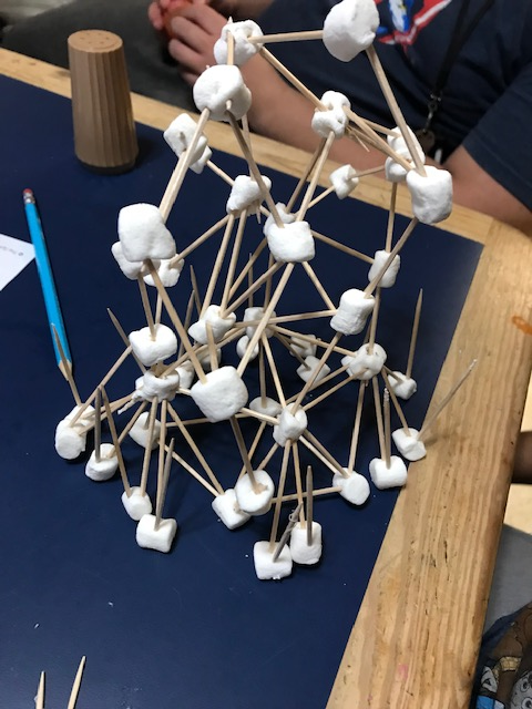 Youth participated in an engineering challenge to create towers using marshmallows and toothpicks. They learned about the importance of creating a solid base, and compared a variety of tower shapes and sizes.