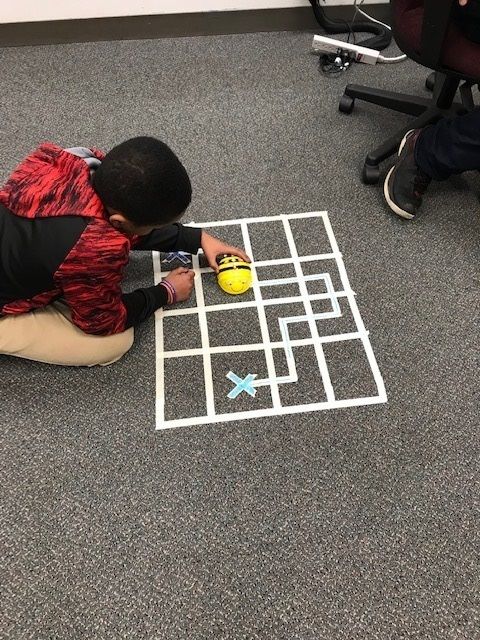 Pictured here is a project youth participated in to code their Bee-Bots to find their way through a maze.