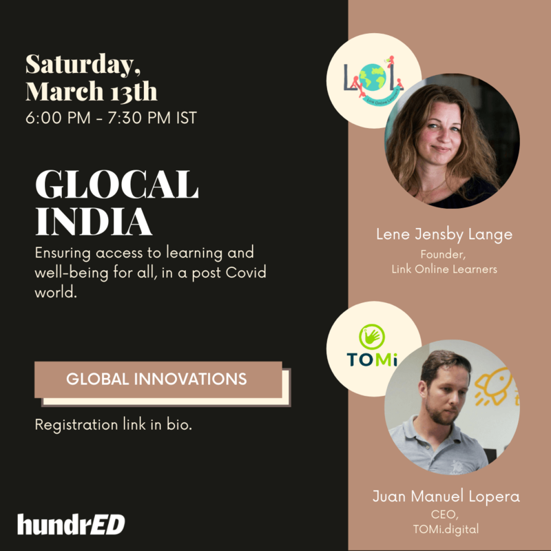 Join us at Delhi’s first HundrED GLocal event on March the 13th 6.00 pm – 7.30 pm Indian Standard Time on Zoom, to explore how to ensure access to learning and well-being for all in the post-COVID world. Innovators from India and across the world will showcase innovative strategies and systems which enable students to continue access to learning and well-being during COVID and post-COVID time. Presenters will share examples of how their innovation will enable access to learning and well-being in a post-COVID world. We look forward to fostering lively conversation among educators, innovators, administrators, and students. Together we will work to implement these practices that will ensure learning and well-being to students in the current scenario.