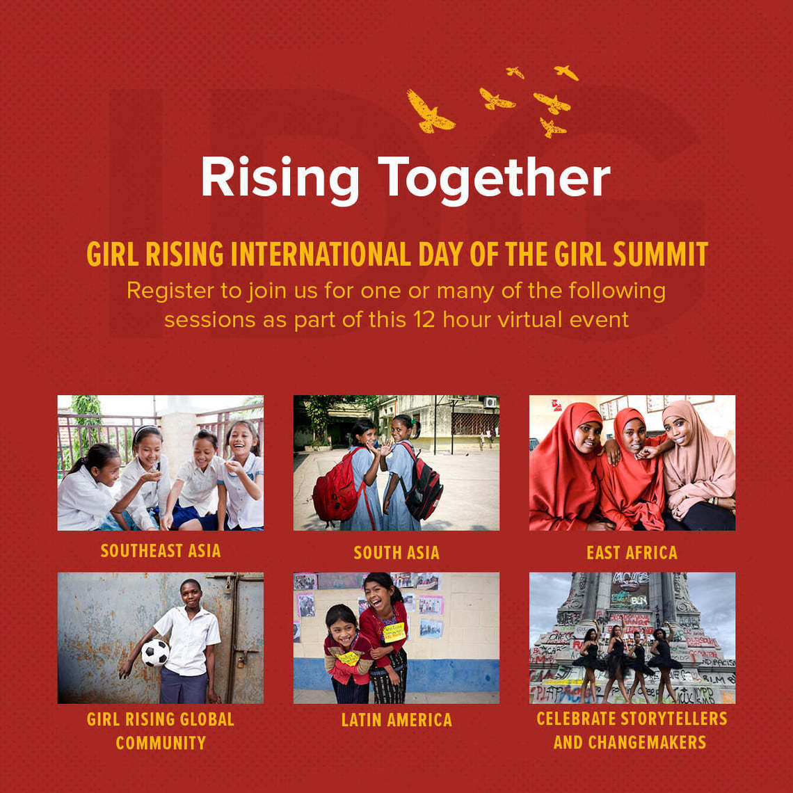 Thousands of girl champions from around the world gather at our 12-hour virtual summit on Oct. 10, 2020, in celebration of International Day of the Girl. The summit takes you across the globe, from Asia to Africa to South and North America, meeting inspiring leaders, passionate activists, determined young people, and dynamic educators – and listening in on spirited conversation, music, poetry, and inventive stories of challenge and change. More here: www.girlrising.org