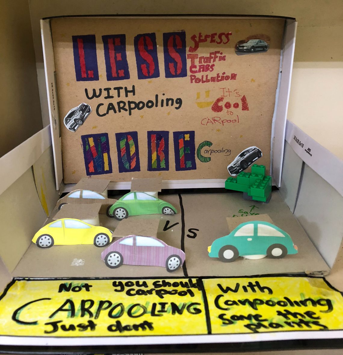 The students who worked on the carpool campaign aimed to give a more visual representation of how carpooling can reduce the amount and effect of pollution in the atmosphere. According to the group, the toxic pollutants that come from cars have been adding to the rising level of carbon dioxide in the atmosphere which traps more and more sunlight, raising the temperature on earth’s surface. Moreover, this would also lessen the effects of car emissions to one’s health and to the heavy traffic exprienced everyday in major cities. So, using recycled materials, they imagined a campaign material that would compare the effect of carpooling to the usual drive-your-own-car situations.