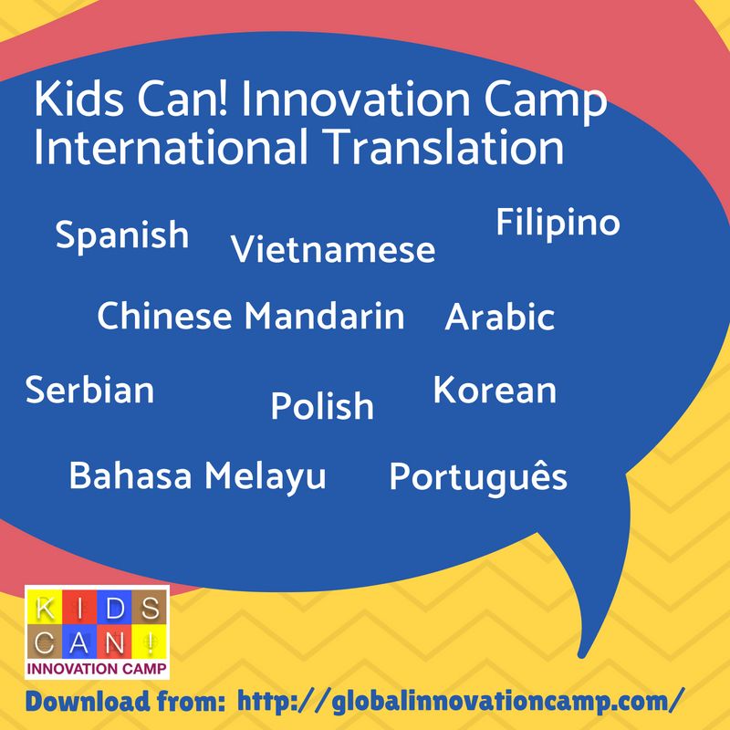 We now have 10 international translations and 1 local translation of the Kids Can Innovation Camp! We continue to bring the Camp to every learner in every language! In the pipeline: Japanese, Hindi, Romanian and more!!!
