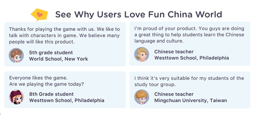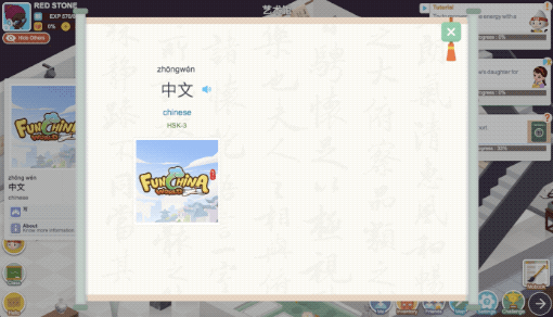 Fun China World is not just a game. It is also a game-based learning platform consisting of rich stories and interesting characters, which helps you to learn Chinese in a pleasant and engaging atmosphere.